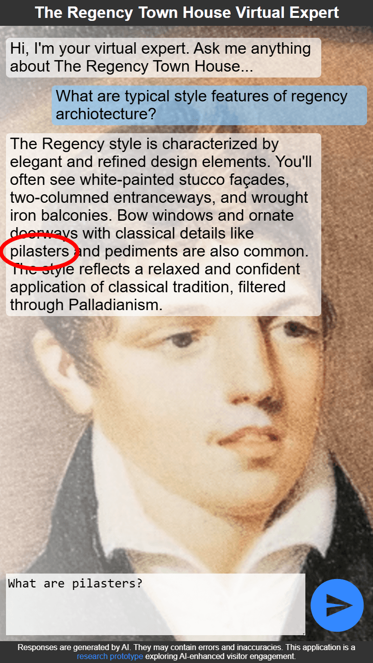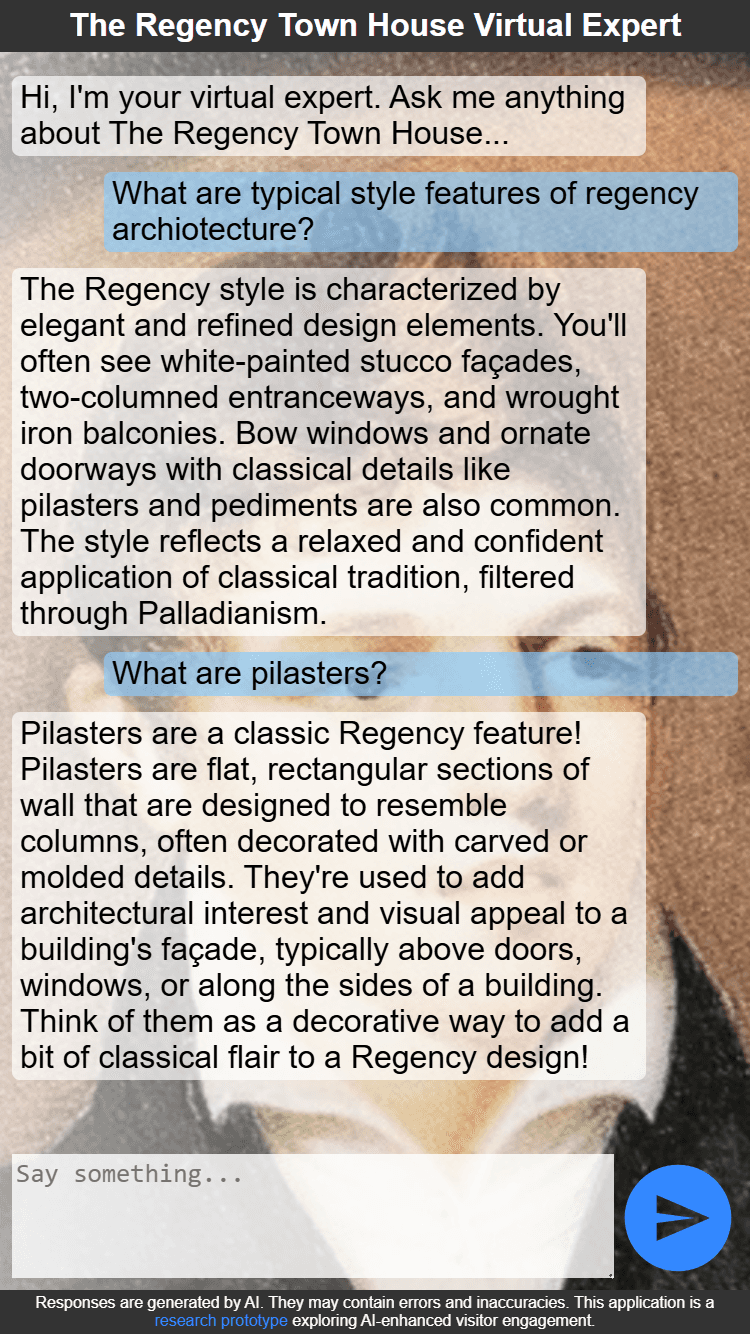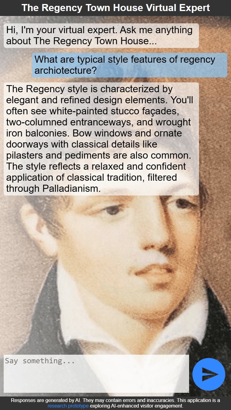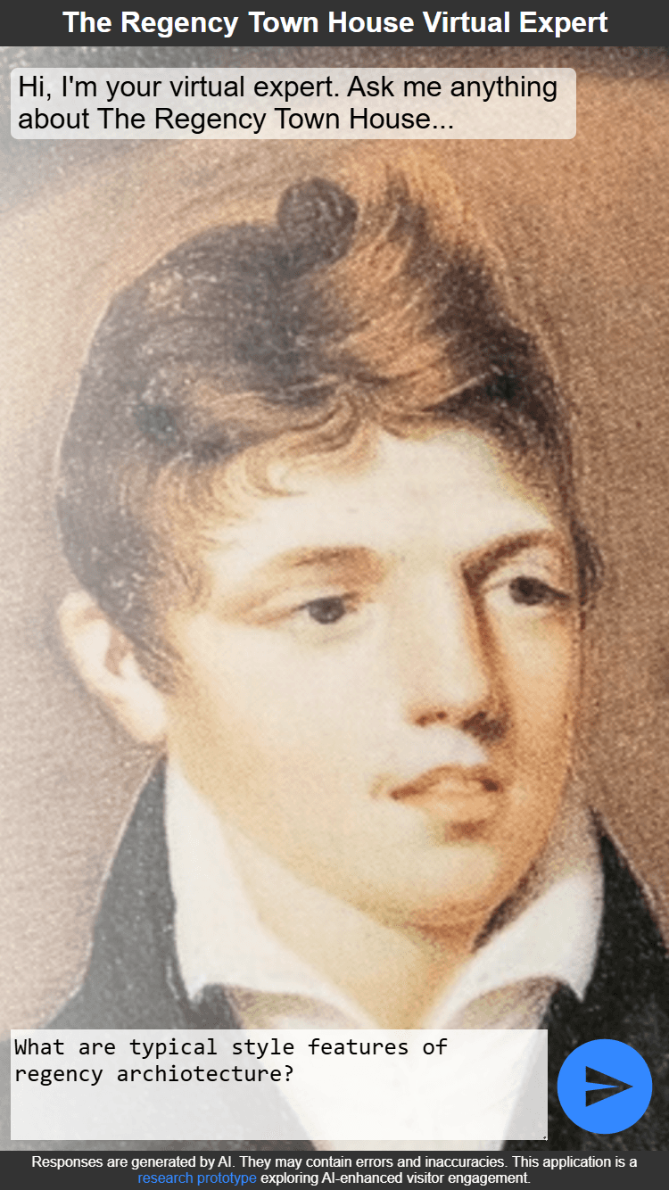 The Regency Town House has rich architectural and social history knowledge, but visitor learning depends on staff availability. A prototype AI chat expert was built to bridge this gap, but key questions remained unanswered: Do visitors want to use AI for expert knowledge? What modality (text vs. voice) feels right in a heritage space? What accuracy threshold matters? How do device and context shape interaction? These insights were needed to validate the concept before further investment.
